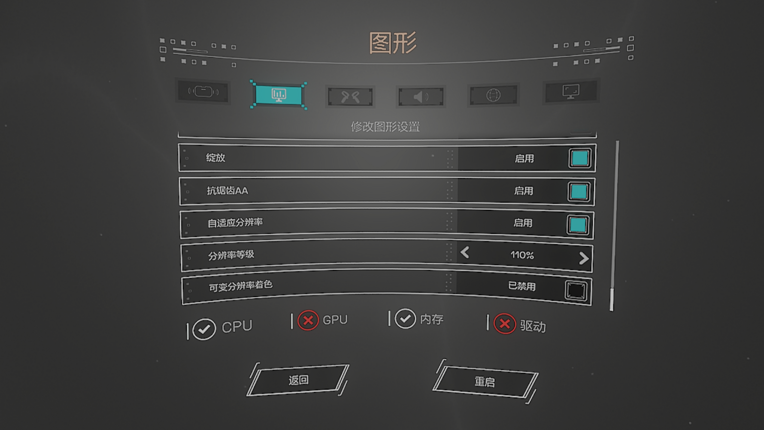 4、如果游戏字幕或者对话出现大量问号,请调整游戏设置-图形-分辨率等级,一般需要调整至100%及以上,并且关闭可变分辨率着色以及动态分辨率,如遇游戏频繁闪退,那就是特效开高了,官方说之前的版本开了maxx抗锯齿可能会导致游戏崩溃,而且我们字体目前用的是高分辨率的贴图字体,文字量也大,尽量把游戏的抗锯齿和阴影都关掉;