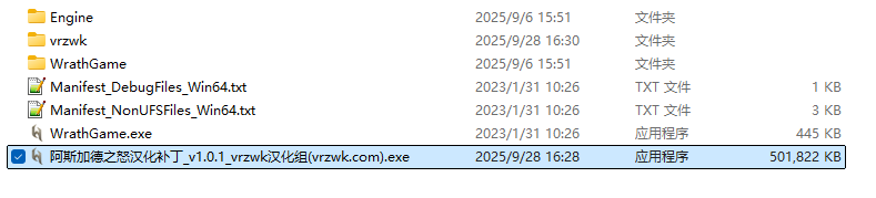 1、将此汉化补丁exe放置在游戏根目录(和WrathGame.exe、WrathGame文件夹、Engine文件夹的同一级的这层目录)